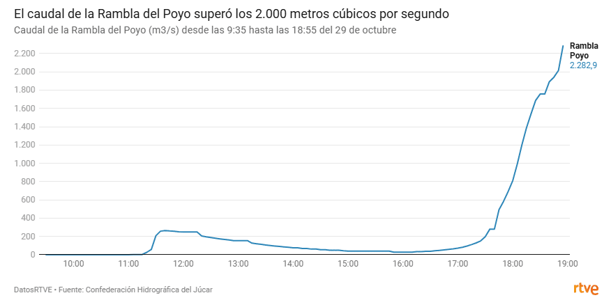 A las 9.48 se emite el aviso “rojo” a todo el litoral valenciano y, unos doce minutos más tarde, el Centro Coordinador de Emergencias de la Generalidad valenciana, dependiente de la Consejería de Justicia, declara la “alerta nivel rojo”. En la parte alta de los barrancos llevaba ya más de dos horas jarreando, tanto que sobre las 11.30 se desborda el barranco de Chiva, que aguas abajo, junto a las aportaciones de otros arroyos y ramblas, se une al barranco del Poyo. Antes de alcanzar Torrent el caudal de todas estas aportaciones hídricas alcanzaba los 2.230 m3/seg, una cifra muy superior a otras crecidas anteriores.