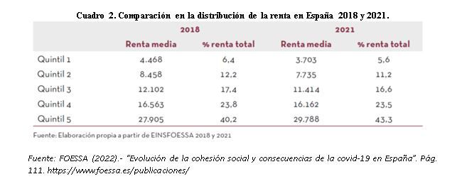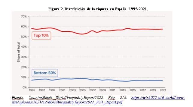 Muy al contrario de lo que debería suponer el objetivo 1, desde que se anunciaron los ODS, completamente asumidos por la Agenda 2030, la distancia entre ricos y pobres se ha incrementado. Durante la última década, el 1 % más rico ha capturado alrededor del 50 % de la nueva riqueza, concretamente en el periodo comprendido entre 2020 y 2022 el 1% más rico acumulaba el 63% de la riqueza producida en el mundo durante en esos dos años. En España, según el estudio del World Inequality Lab, publicado en diciembre de 2021, el 1% de los españoles más ricos poseía el 24,2% de la riqueza patrimonial del país, mientras que el 50% más pobre solo dispone del 6,7%. Evidentemente la evolución de la distribución de la riqueza y la renta en España no es ideal ni mucho menos como puede apreciarse en los gráficos que se acompañan, aunque respecto a muchos países europeos España no está mal situada.