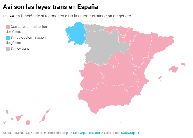 Fruto de la acción de todos ellos, muchas de las Comunidades Autónomas, haciendo uso de sus competencias han legislado al respecto. Y han llevado adelante tratamientos hormonales y quirúrgicos para las personas trans. 15 CC.AA. han aprobado leyes que permiten cambiar de nombre y sexo en la tarjeta sanitaria y en otros documentos autonómicos, sin necesidad de hormonación o informe de disforia de género. En algunas de ellas, como Cataluña, Madrid, Aragón, Baleares, Cantabria y Valencia exigen explícitamente en su normativa legal que los padres de los menores den su consentimiento antes de que sus hijos inicien cualquier tratamiento hormonal. La edad exigida para el consentimiento varía según la comunidad, pero existe esa posibilidad.